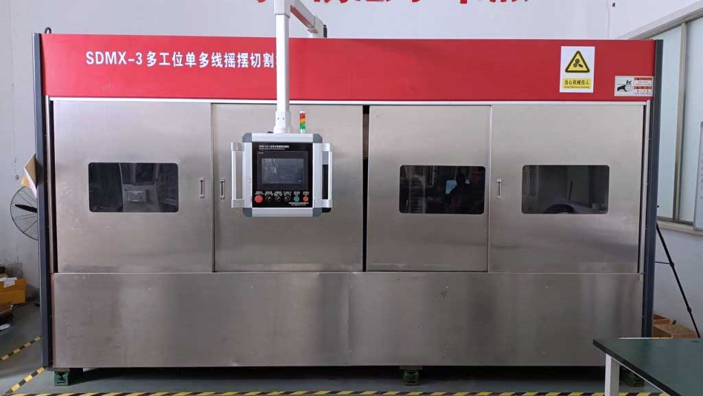 通過多根高速穩定往復運轉的金剛線對固定在工作區間內的晶體坯料進行精密切割,在其工作區間內,一次能夠同時切割幾十到幾千片同一厚度的產品,所以常被用于大批量產品的快速精密加工。