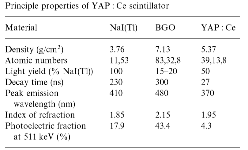 1. 為了使受檢者受到的輻射劑量最小化并縮短成像時間,要求晶體以高的檢測效率或阻斷能力來檢測511keV的γ光子,因此優選具有較高的有效原子序數和密度的晶體。