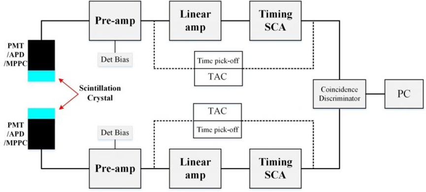 下圖顯示了事件電路檢測器的基本結構。圖中的基本檢測單元是一對與閃爍晶體耦合的光子檢測器(PMT / APD / MPPC等)。檢測器接收到的光子產生的電信號被傳輸到前置放大器進行信號放大,因此,要求閃爍晶體具有更高的光輸出和更短的衰減時間。