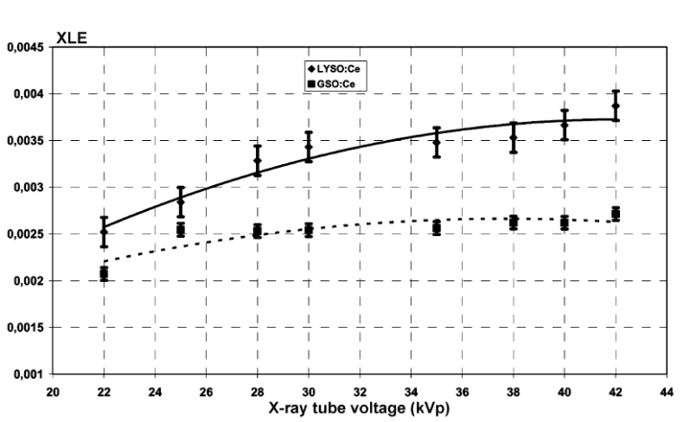 The x-ray luminescence efficiency (XLE) of Ce:LYSO and Ce:GSO as determined by the experimental data for x-ray tube voltages between 22–42 kVp (mammography). Points: measured data, line: fitted curve