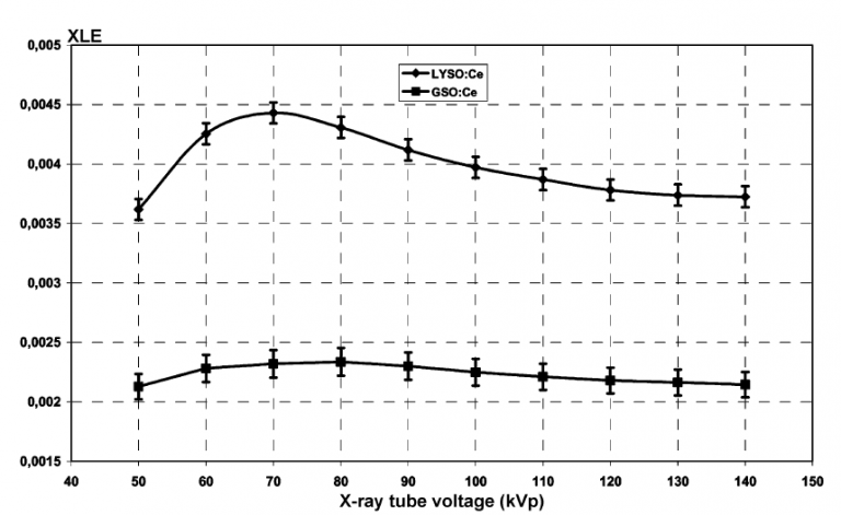 The x-ray luminescence efficiency (XLE) of Ce:LYSO and Ce:GSO as determined by the experimental data for x-ray tube voltages between 40–140 kVp (general radiography). Points: measured data, line: fitted curve