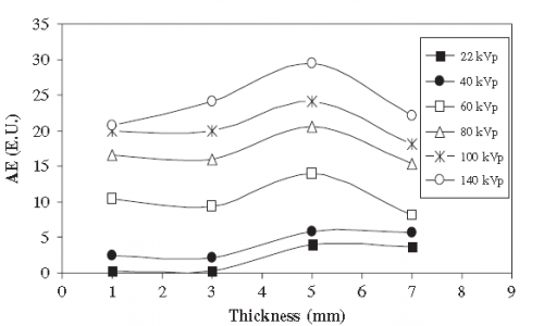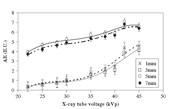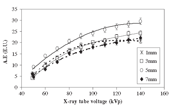 Variation of absolute luminescence efficiency(AE) of CsI:Tl crystals for Mammography(40–140kVp) X-ray tube voltages. AE units: μWs/mRm2.Points: measured data, line:fitted curve