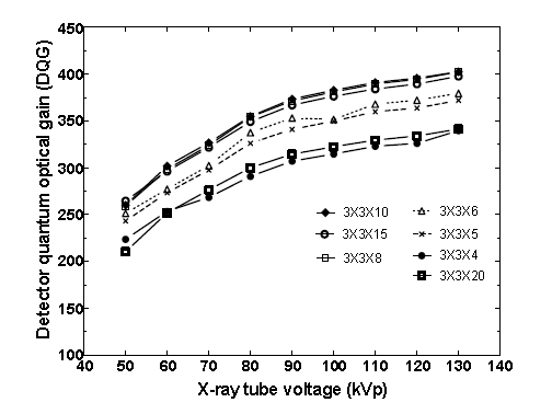 Variation of the detector quantum gain (DQG) of the Ce:GAGG crystals with X-ray tube voltage